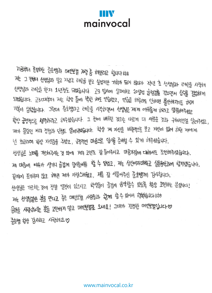 상호 : 메인보컬 실용음악학원 ㅣ 종목 : 실용음악교육 ㅣ 대표 : 노신애 ㅣ 학원사업자등록번호 : 842-93-00366 주소 : 서울특별시 성북구 동선동 1가 47번지 2층 (도로명) 성북구 보문로 34길 35, 2층 ㅣ Tel : 02-929-0709