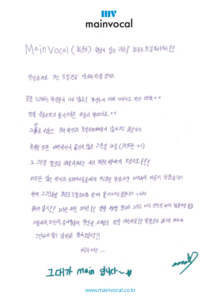 상호 : 메인보컬 실용음악학원 ㅣ 종목 : 실용음악교육 ㅣ 대표 : 노신애 ㅣ 학원사업자등록번호 : 842-93-00366 주소 : 서울특별시 성북구 동선동 1가 47번지 2층 (도로명) 성북구 보문로 34길 35, 2층 ㅣ Tel : 02-929-0709