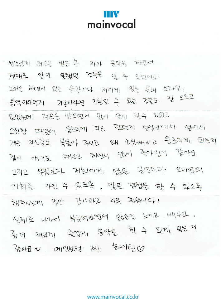 상호 : 메인보컬 실용음악학원 ㅣ 종목 : 실용음악교육 ㅣ 대표 : 노신애 ㅣ 학원사업자등록번호 : 842-93-00366 주소 : 서울특별시 성북구 동선동 1가 47번지 2층 (도로명) 성북구 보문로 34길 35, 2층 ㅣ Tel : 02-929-0709