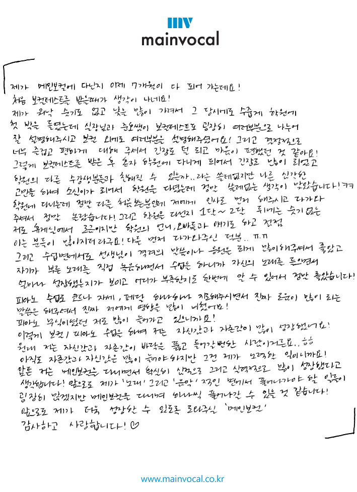 상호 : 메인보컬 실용음악학원 ㅣ 종목 : 실용음악교육 ㅣ 대표 : 노신애 ㅣ 학원사업자등록번호 : 842-93-00366 주소 : 서울특별시 성북구 동선동 1가 47번지 2층 (도로명) 성북구 보문로 34길 35, 2층 ㅣ Tel : 02-929-0709