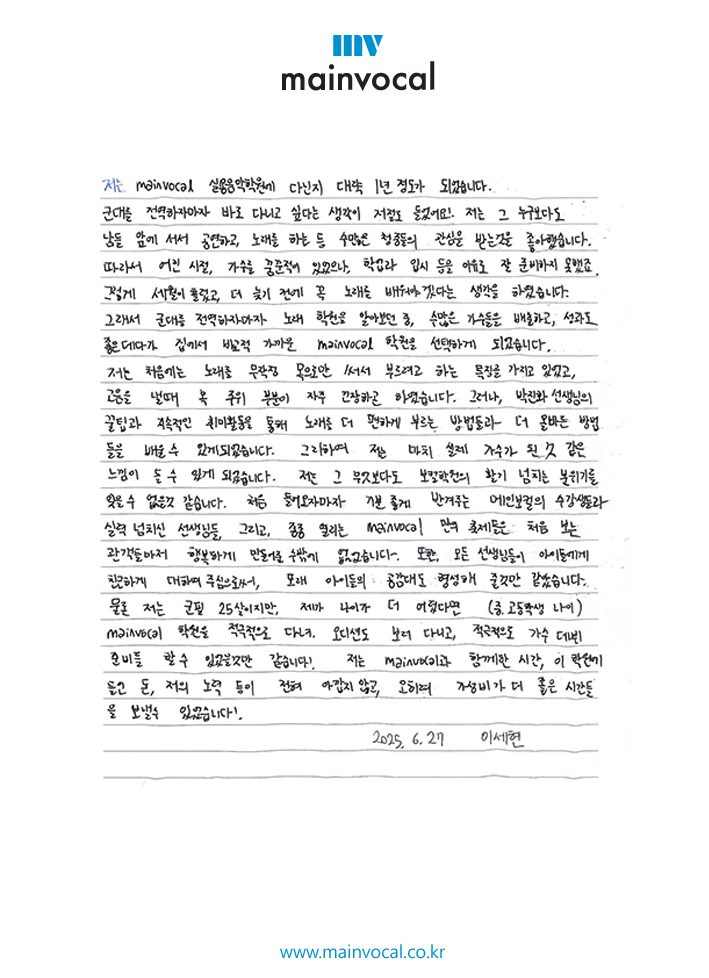 상호 : 메인보컬 실용음악학원 ㅣ 종목 : 실용음악교육 ㅣ 대표 : 노신애 ㅣ 학원사업자등록번호 : 842-93-00366 주소 : 서울특별시 성북구 동선동 1가 47번지 2층 (도로명) 성북구 보문로 34길 35, 2층 ㅣ Tel : 02-929-0709