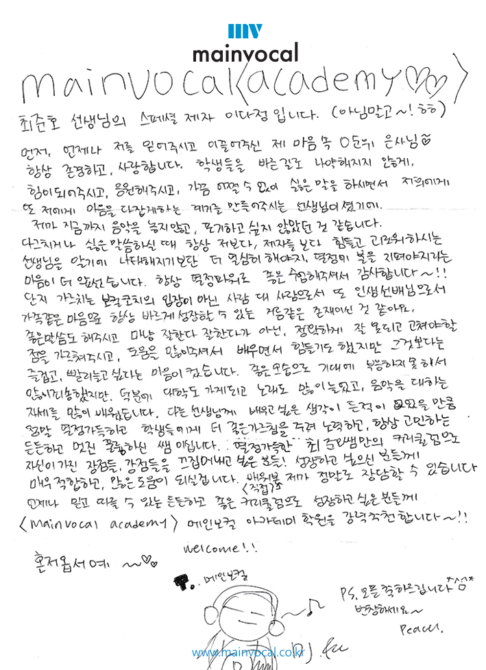 상호 : 메인보컬 실용음악학원 ㅣ 종목 : 실용음악교육 ㅣ 대표 : 노신애 ㅣ 학원사업자등록번호 : 842-93-00366 주소 : 서울특별시 성북구 동선동 1가 47번지 2층 (도로명) 성북구 보문로 34길 35, 2층 ㅣ Tel : 02-929-0709