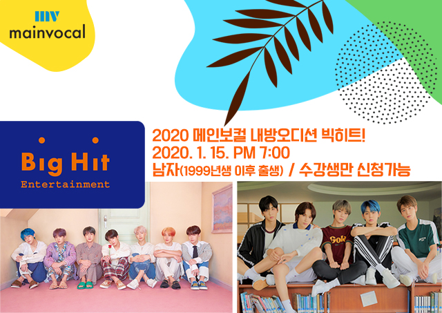 2020 메인보컬학원 첫 내방오디션, K-POP의 새역사를 쓰고 있는 빅히트가 메인보컬학원과 함께 합니다! 2020 새해를 준비하는 메인보컬은 그 어느 때보다 바쁜 시간을 보내고 있습니다^^ 메인보컬 수강생 여러분 역시 내년을 준비하는 마음으로 멋진 연말 보내길 바라며, 현재 다수의 합격자를 배출하고 있는 메인보컬의 무제한 내방오디션 일정을 안내해 드립니다! 2020 첫 기획사는 바로, 세계적인 그룹으로 k-pop의 역사를 새로 쓰고 있는 그룹 BTS(방탄소년단)와 올 해 신인상에 빛나는 TXT가 소속된 빅히트 엔터테인먼트입니다^^ 빅히트 내방오디션은 남자만 참여가 가능하며, 담당 선생님과 확인 후 오디션을 준비하시기 바랍니다^^ 모두에게 좋은 결과가 있길 바라며, 메인보컬 수강생 여러분의 꿈이 이뤄지는 기회가 되길 바랍니다! (아티스트 이미지는 빅히트로부터 직접 제공받은 사진으로 불펌을 금합니다)