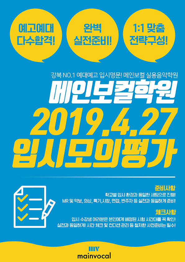 메인보컬 실용음악학원 입니다^^ 보컬입시 전문인 메인보컬 실용음악학원은 입시특화 커리큘럼은 물론 상반기와 하반기 각각 실전과 동일한 입시모의평가를 진행합니다! 1:1 입시전략 체크는 물론, 실전과 동일한 진행방식으로 입시를 보다 빠르고 정확하게 준비하고 있습니다! 지난주까지 진행된 공연수업, 메인라이브와 더불어 앞으로도 목적에 맞는 다양한 자체 프로그램들을 통해 실제 입시때까지 쉬지 않고 달려갈 예정입니다. 입시 모의평가 일정 및 준비사항은 각 담임선생님께 문의해주세요!