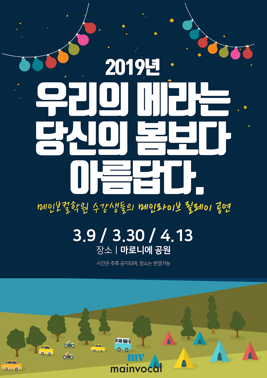 메인보컬 실용음악학원 입니다^^ 공연이 곧 수업이 되는 메인보컬의 공연수업인 메라!(메인라이브) 2019년 메인라이브는 릴레이 버스킹 공연으로 함께 합니다! 실전 공연은 메인보컬 수강생 여러분의 보컬 실력 향상은 물론 꿈을 현실로 바꾸기 위한 소중한 경험이 될 것입니다! 메인라이브 일정과 장소를 확인하시고 스스로를 위한 시간에 최선을 다하는 멋진 여러분을 기대합니다!