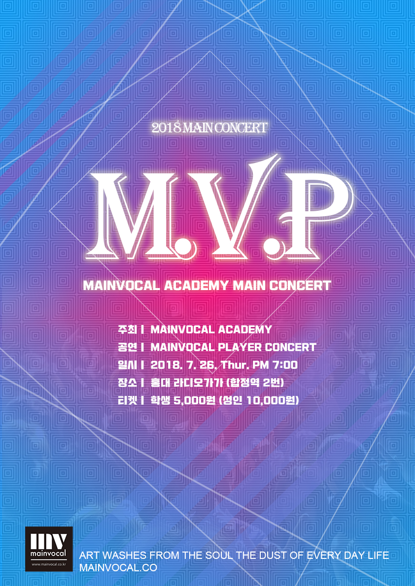 [공연을 사랑하는 메인보컬 실용음악학원 2018 콘서트, M.V.P_Main Vocal Player 티켓팅 스타트!!] 드디어! 프로페셔널한 공연으로 많은 이슈와 출연자들의 다수 입시, 오디션 합격은 물론 관객들의 환호가 가득했던 메인보컬 M.V.P 공연이, 2018. 7월 여러분을 찾아갑니다! 차원이 다른 공연 퀄리티로 관객들에게는 멋진 공연의 즐거움을!! 기획사 관계자들의 참관으로 무대위 주인공들에게는 잊지 못할 기회가 될 이번 M.V.P 공연! 관객 여러분의 많은 참석과 기대 바랍니다!