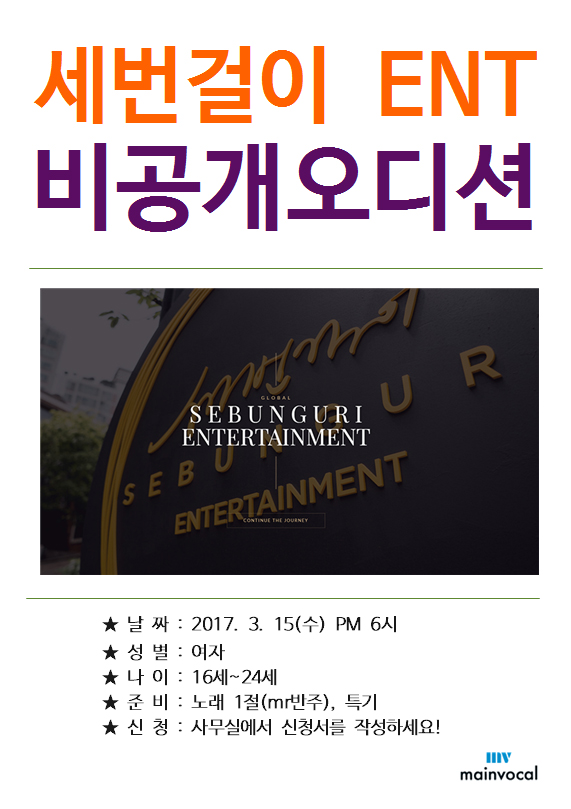 이전글 다음글 목록 본문 [진행완료] 3월 1차 공개오디션 접수중입니다^^ | ~ 안녕하세요, 메인보컬입니다^^ 글로벌엔터테인먼트인 세번걸이 엔터테인먼트 내방 오디션이 3월 15일(수) 오후 6시에 진행됩니다^^ 수강생 여러분들은 사무실에서 신청서를 작성해주세요^^ 댓글목록 등록된 댓글이 없습니다. 이전글 다음글 목록