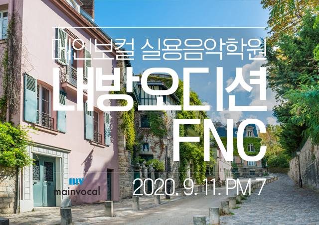 메인보컬 실용음악학원 입니다^^ [메인보컬 무제한 오디션 시스템] 9월 내방오디션은 SF9이 소속된 FNC엔터테인먼트 입니다^^ 매 달 진행되는 메인보컬학원의 내방오디션은 앞으로도 대형기획사의 일정이 예고되어 있는데요, 메인보컬 수강생 여러분들의 꿈을 위한 도전에 큰 기회가 되길 바랍니다! 오디션의 자세한 일정과 준비사항은 담임선생님께 확인 후 신청 접수해 주시기 바랍니다^^