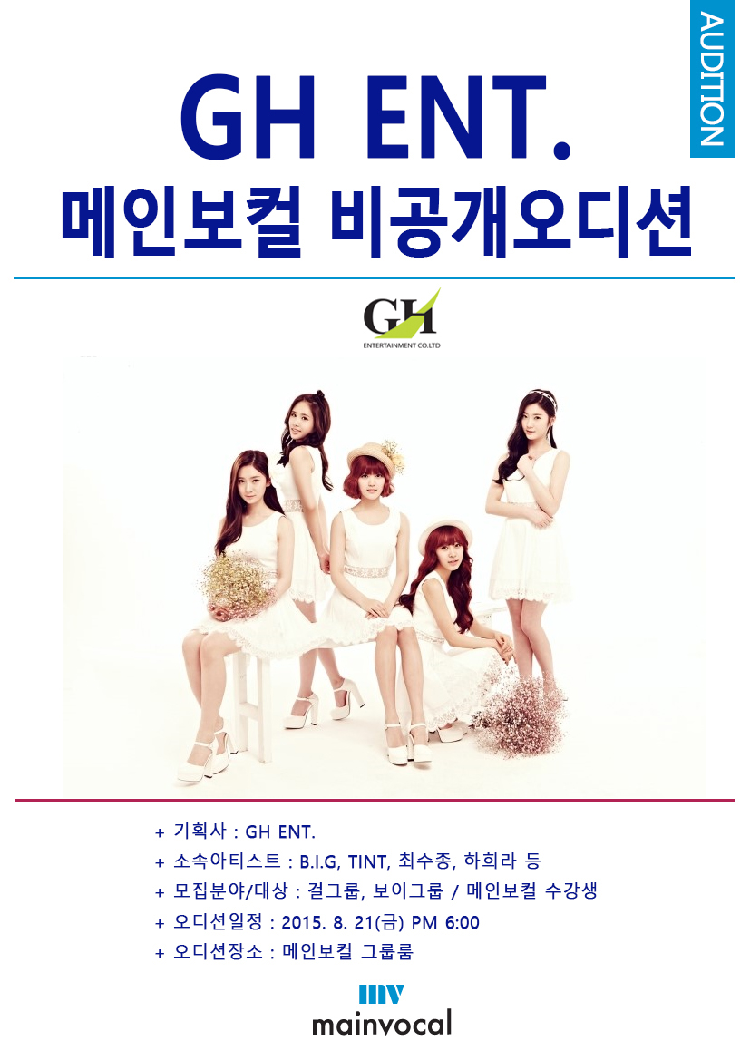 이전글 다음글 목록 본문 GH ENT. 비공개 오디션 접수시작!! | 2015-07-30 ~ 메인보컬 수강생을 위한 오디션이 계속해서 진행되고 있습니다~ 마마무 기획사 오디션에 이어 걸그룹 '틴트'가 소속된 GH ENT. 오디션을 메인보컬 수강생만을 대상으로 원내에서 직접 진행합니다^^ 수강생 여러분은 사무실에 신청해주시기 바랍니다^^ 무더운 여름! 다들 화이팅하세요!!^^ Good Luck!!^^ 댓글목록 등록된 댓글이 없습니다. 이전글 다음글 목록